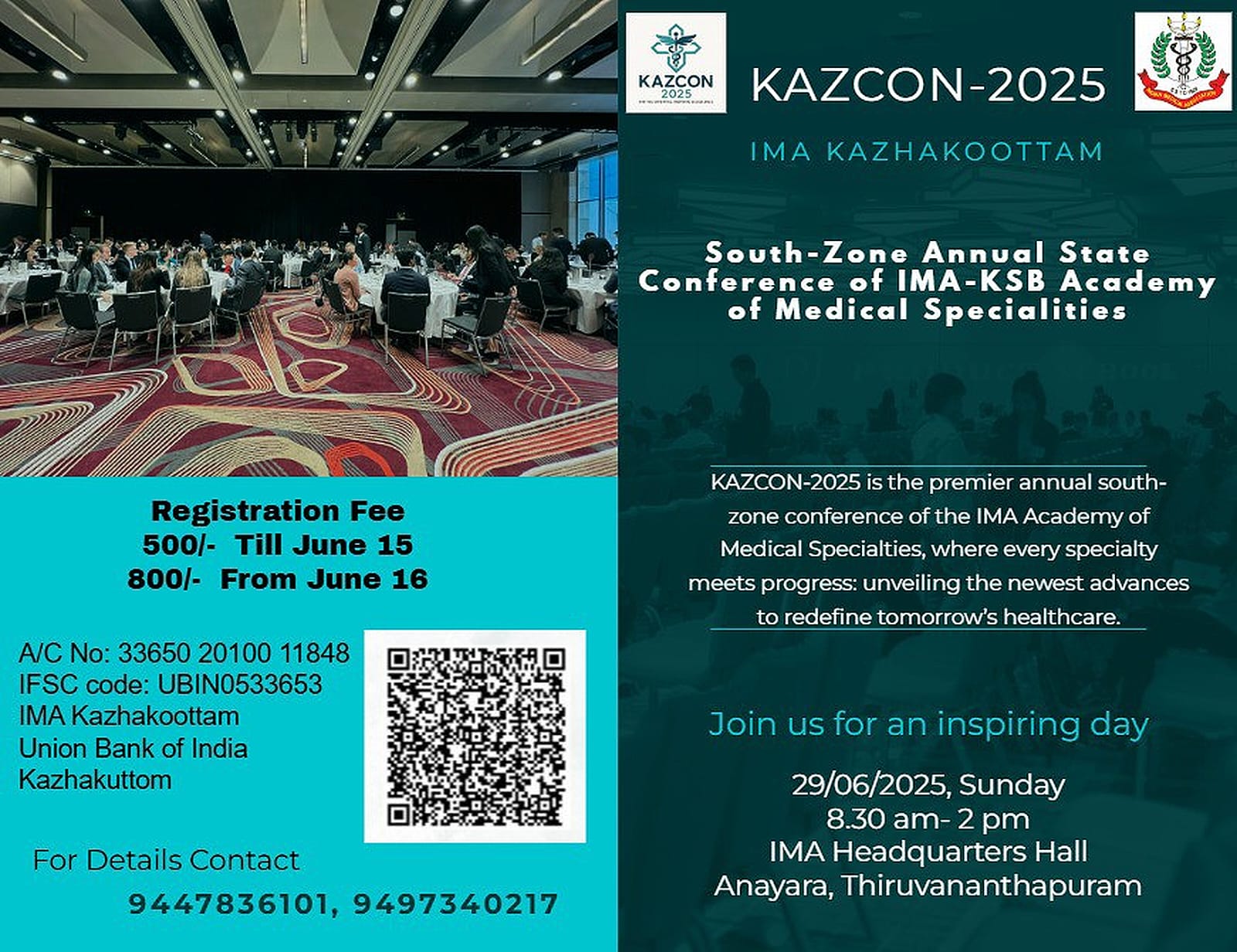 The Indian Medical Association (IMA) Kazhakoottam is a vibrant branch committed to the welfare of doctors and the promotion of public health. IMA Kazhakoottam branch was formed on 1999. Prof (Dr) Rajendran RD was the first President and Dr Binoy S was the secretary. It has got about 350 members. The branch actively engages in numerous professional, social, cultural, and community-oriented initiatives.